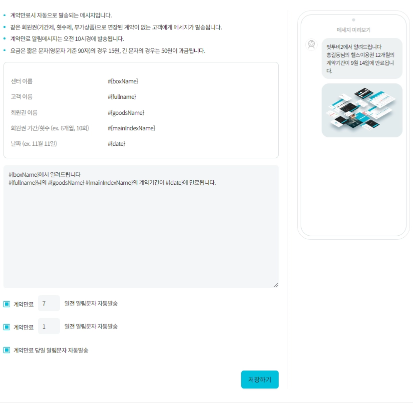 회원권 만료 메시지 - 회원권(기간제, 횟수제, 부가상품) 계약만료시 자동으로 발송되는 메시지