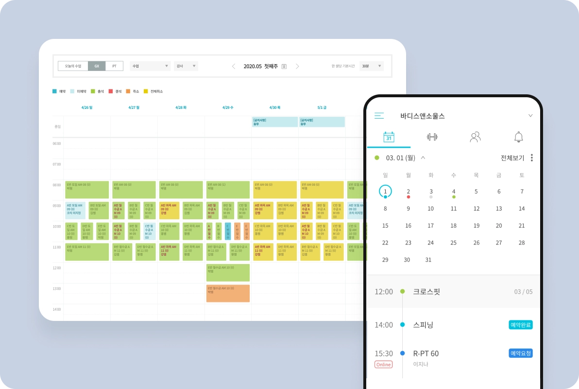 관리자가 한 눈에 볼 수 있게 일정 칸을 큼직하게 준비했습니다.강사, GX수업, PT수업 별 필터링도 가능합니다.