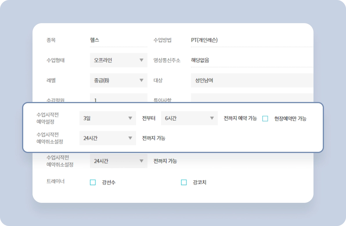 클래스마다 예약 정책을 다르게 하고 싶으신가요?저희 핏투비는 자유롭게 예약 및 예약취소 설정이 가능합니다.