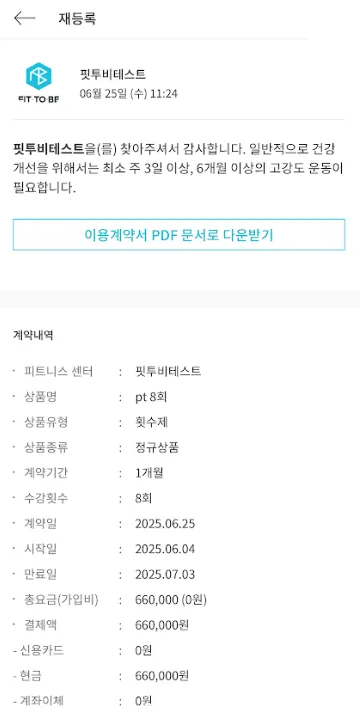 결제한 계약 내역 확인이 가능하며 이용계약서를 PDF로 다운 가능합니다.