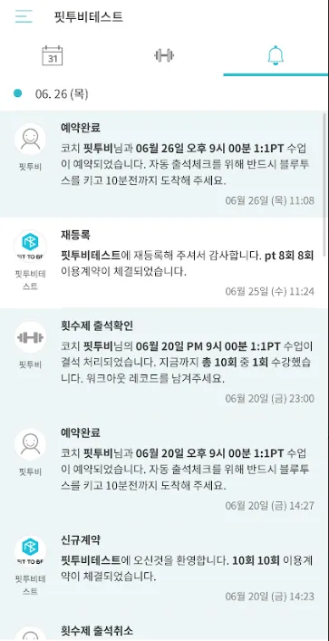 핏투비 회원 앱 상단 가장 오른쪽 탭이 알림 탭입니다.