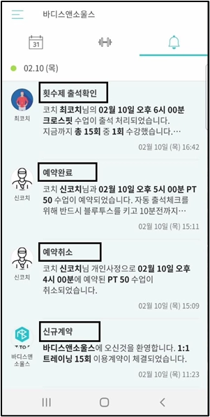 회원권 등록, 예약, 예약취소, 수업 시작 하루 전, 수업 시작 한 시간 전, 출석, 다른 사용자 수강후기 기록, 만료 한 달 전 등 다양한 상황에서 자동으로 알림이 전송됩니다.