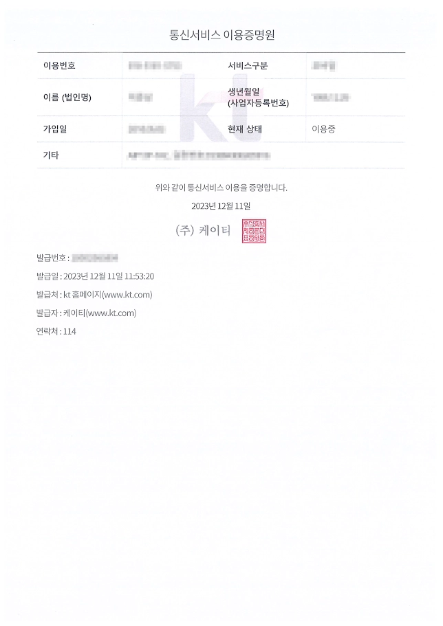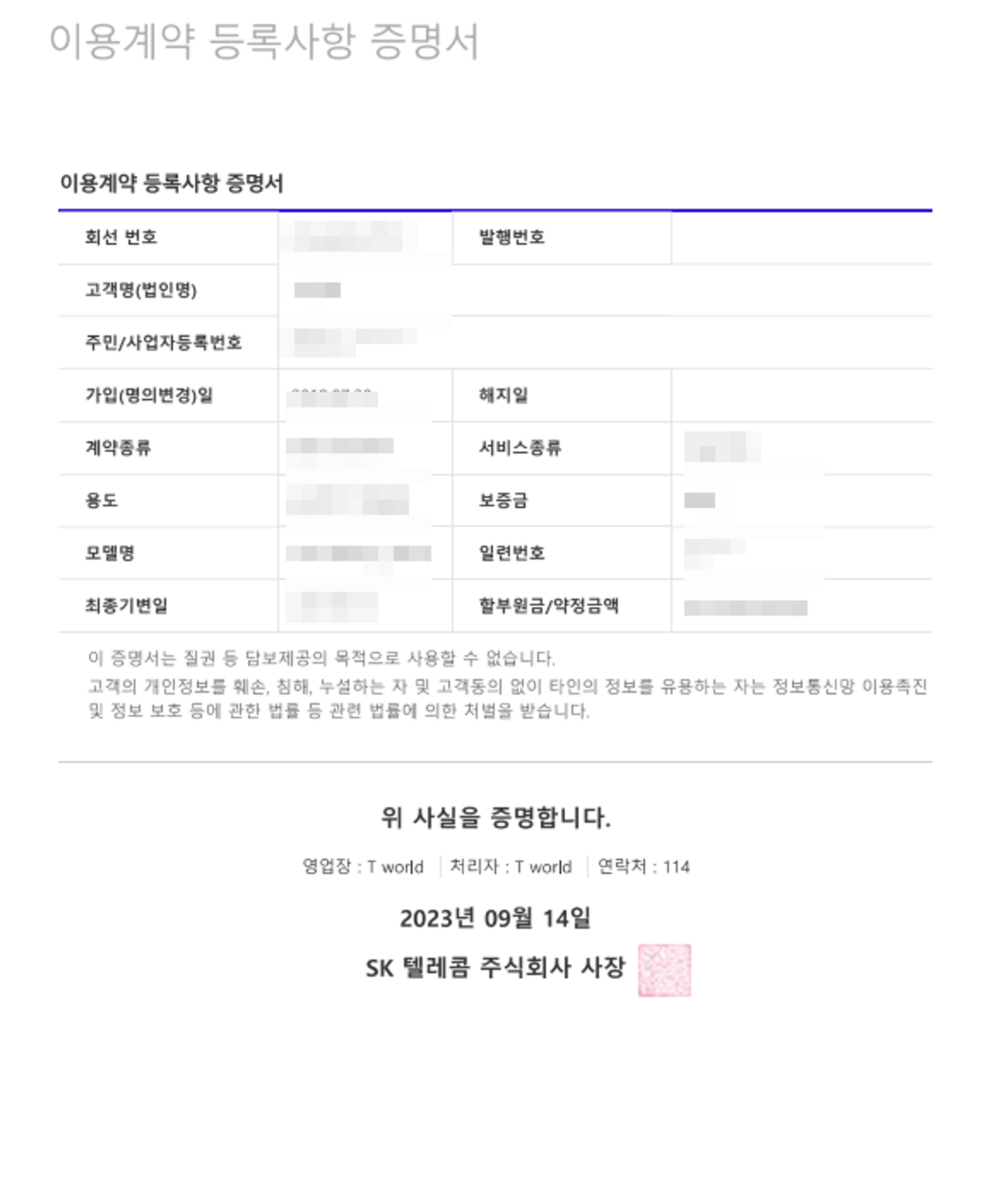 이용계약증명서에는 휴대폰 번호, 이름, 주민등록번호(뒷자리는 표시되지 않음), 가입/명의변경/해지일, 서비스 종류, 용도, 보증금, 기기 정보(일련번호 앞 2자리 외에는 표시되지 않음), 최종 기기변경일, 할부 원금 등이 기재됩니다.