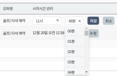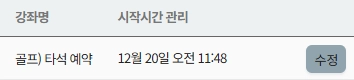 시작시간 관리: 시작시간을 인위적으로 줄이거나 늘려드릴 때 사용합니다. 사용 중인 좌석 번호를 누른 후 “수정” 버튼을 눌러 시간을 수정합니다.
