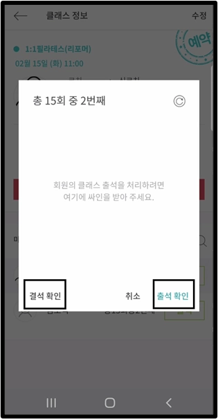 실제 결석을 하였을 경우 회원이 다음 수업에 왔을 때 결석 버튼을 누르고 결석 서명을 받아야 최종 결석이 됩니다.