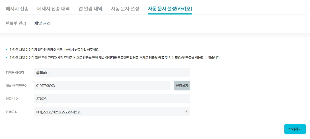 카카오톡 자동메시지 기능을 사용하기 위해서는 비즈니스 채널과 핏투비를 연동해야합니다.